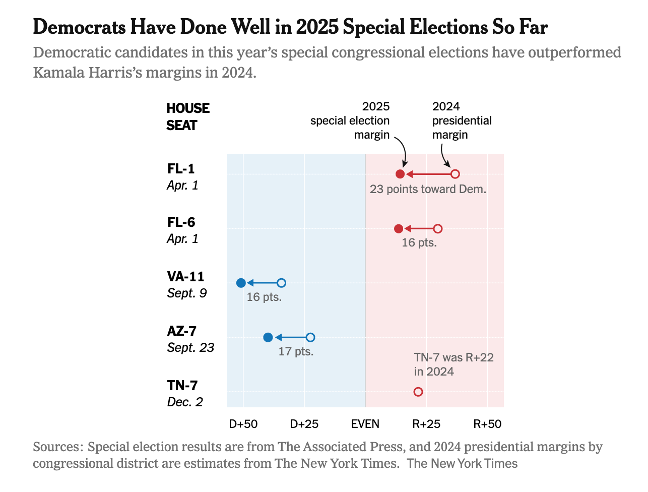According to a New York Times analysis of 2025 special elections, Democrats have been overperforming their 2024 margins in special congressional races in Florida, Virginia, and Arizona by double digits, in some cases by between 16 and 23 points.