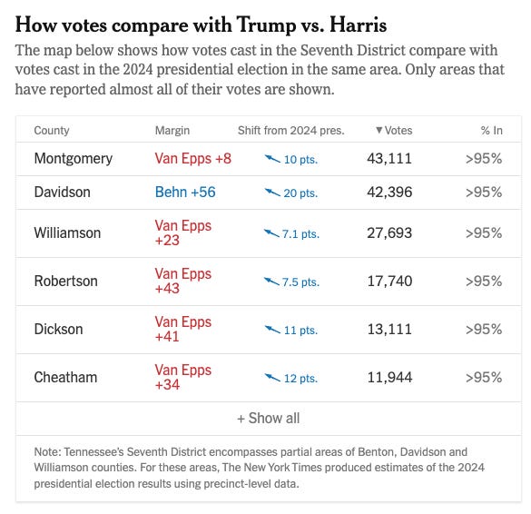 A 12 to 13 point shift left in a deep red Tennessee district, with turnout close to a midterm.