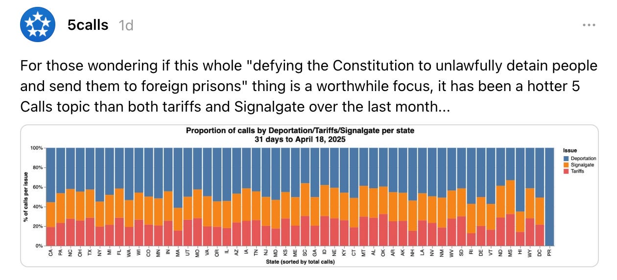 This admission opens a rare window for accountability, and people are responding. According to 5calls.org, this issue has sparked more calls than both tariffs and Signalgate over the past month.